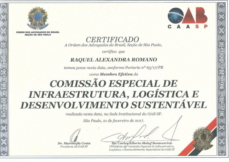 RAQUEL ALEXANDRA ROMANO – MEMBRO EFETIVO DA COMISSÃO DE INFRAESTRUTURA, LOGÍSTICA E DESENV. SUISTENTÁVEL – OAB/SP – 2017/2019